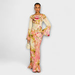 Entre num mundo de romance com o nosso vestido maxi para festas no jardim, projetado para celebrar a forma feminina. Este deslumbrante vestido apresenta uma mistura harmoniosa de estampas vibrantes que ganham vida a cada movimento.